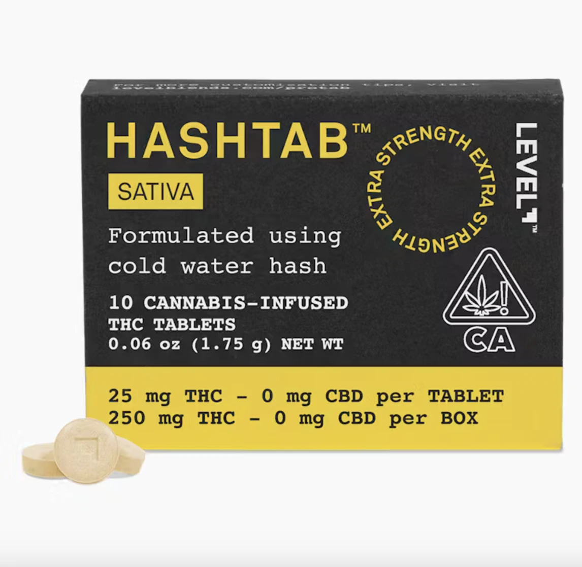 Our classic hash high is also available in a 100 mg single pack. The LEVEL Sativa Hashtab 100 single pack contains one 100 mg professional-strength swallowable cold water hash tablet that takes effect in 30–90 minutes, with a duration of 3–6 hours. Should you wish to consume a lighter dose, the tablets are scored so you can easily split each tablet in half.